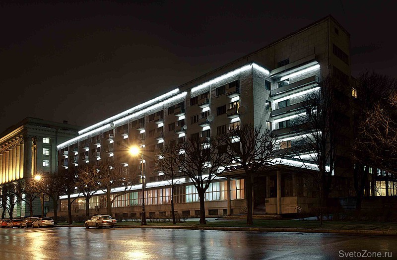 Подсветка убранства фасада здания на Петровской набережной, дом 8 - пилоны, декоративные пилястры, различные барельефные изображения, скульптурная композиция, располагающаяся над высоким карнизом по центру главного фасада - была спланирована так, чтобы выделить декоративные элементы фасада, придать им максимальный объем, подчеркнуть оригинальность решений архитектора. Расставлены вертикальные акценты на уровне второго этажа, линейными линиями выделены высокий венчающий карниз и фриз с барельефными украшениями. Каждая скульптура, установленная на крыше центрального фасада, с двух сторон выделена прожектором.