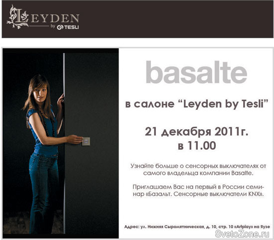 Уважаемые Партнеры! Приглашаем Вас на первый в России семинар по продукции — «Базальт. Сенсорные выключатели. KNX», который состоится 21 декабря в 11 часов в салоне «Leyden by Tesli» по адресу: ул. Нижняя Сыромятническая, д. 10, стр. 10, Аrtplay на Яузе.