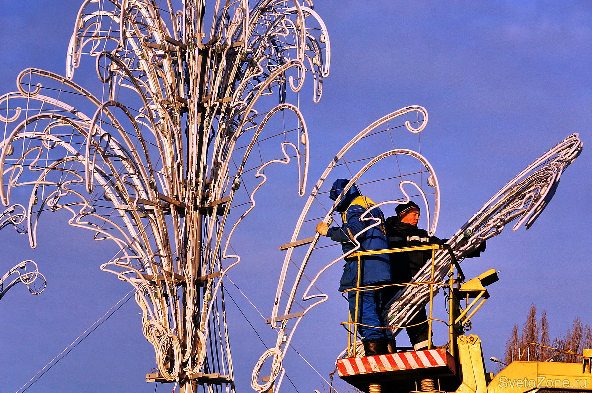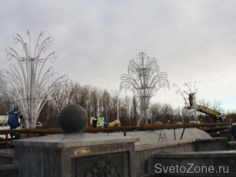 В Липецке завершается установка объемных световых фонтанов. Пятый день на площади Петра Великого работают бригады специалистов муниципального предприятия «Липецкгорсвет» и Санкт-Петербургской компании «Омега». Они уже смонтировали три основные стойки и подвески к ним из легкосплавного металла со светодиодным кабелем. В центре светодинамической композиции расположен фонтан «Зима», два боковых носят название «Брызги». Она занимает весь периметр закрытого до следующей весны цветомузыкального фонтана: 25 метров в длину и 11 – в ширину. Высота поднимающихся кверху голубых и белых «струй» достигает почти шести метров.