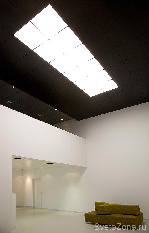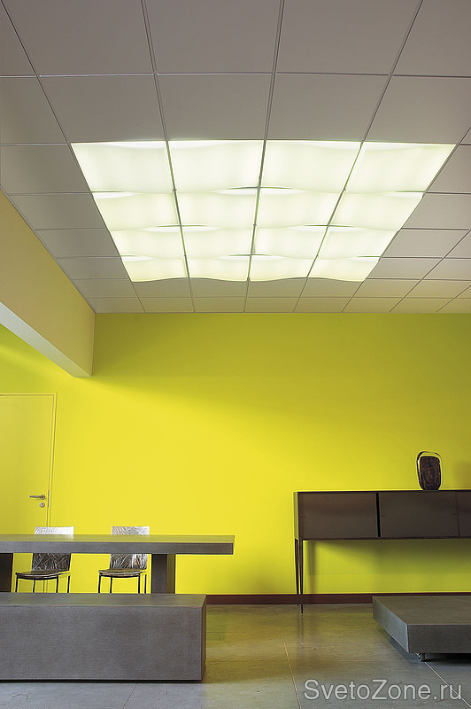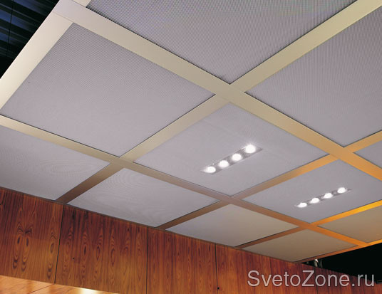 Модульная потолочная система представленна стальными панелями и интегрированными светильниками различных типов, идеально подходит для интерьеров офисов, торговых центров, автосалонов и других помещений.