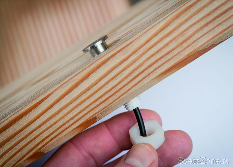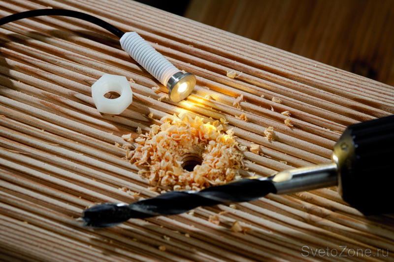 Максимально простой монтаж с помощью втычного соединения. Просверлить отверстие для установки светильника, закрепить светильник декоративным винтом, уложить провода, подключить трансформатор для обеспечения питания в сети (трансформатор, входит в комплект).