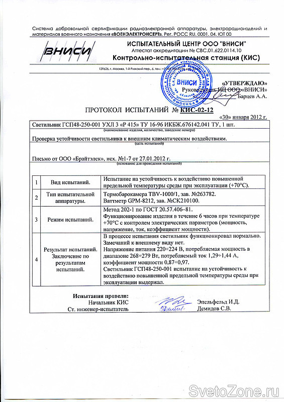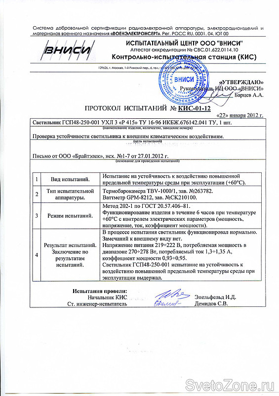 Рабочие характеристики светильника R 415 проверялись при температурах +60◦С и +70◦С. В обоих случаях светильник сохранил свои эксплуатационные качества, о чем свидетельствуют протоколы испытаний.