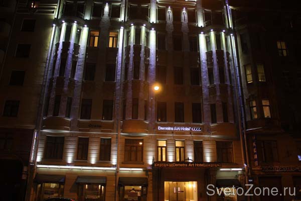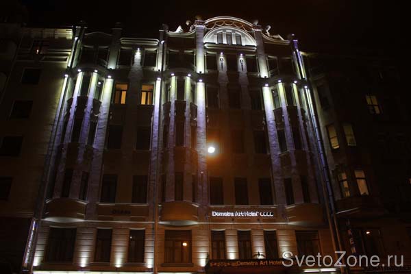 В конце 2011 года осуществлена архитектурная подсветка гостиницы "Арт Отель Деметра". Отель располагается в центре Санкт-Петербурга в историческом здании, возведенном в самом начале ХХ века. Перед открытием гостиницы Art Otel Demetra были произведены масштабные реставрационные работы. По сохранившимся чертежам специалистами компании "Деметра" были восстановлены утраченные элементы фасадов, в том числе и скульптурные группы. Здание признано архитектурным памятником города. Поэтому при проектировании освещения фасадов было особенно важно максимально деликатно вписать светодиодные светильники в архитектурное пространство строения. Использованные в проекте светильники серий IntiROLL, IntiRAY и IntiLINE успешно справились с этой задачей. Установленные под балконами, прожекторы IntiRAY освещают эркерную зону здания. Статуи на крыше подсвечены с фасада несколькими светильниками IntiROLL со специальными удлинёнными кронштейнами. Контур первого этажа обозначен линейными светодиодными светильниками серии IntiLINE производства "IntiLED". Проект архитектурной подсветки выполнен компанией "Театрально Техническая Корпорация".