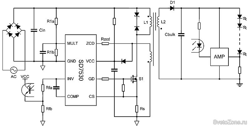 Особенность микросхемы SD7530 состоит в том, что она обеспечивает работу ККМ в режиме критической проводимости CRM (Critical Conduction Mode), т.е. на границе прерывистого и непрерывного токов через индуктор. Кроме того, она имеет выходной драйвер с максимальным током -600 мА и +800 мА. Таким образом, это устройство может управлять мощным MOSFET транзистором.