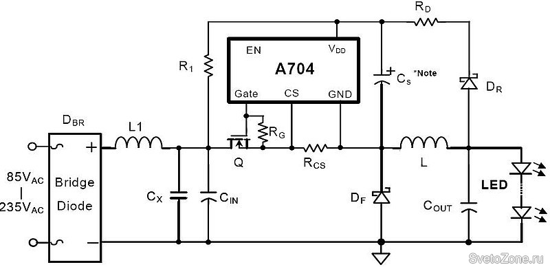 На рисунке 1 приведена типовая схема включения микросхемы А704 в осветительных лампах с цоколем Е27.