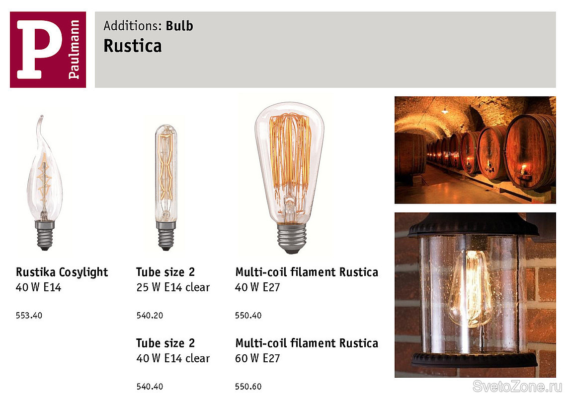 - Стр. 483. Раздел: Лампы накаливания. Серия «Rustika». Возвращение лампы в активный ассортимент, спустя несколько лет, и что, немаловажно, нумерация артикулов осталась прежней. Многократно перекрученные нити накала внутри прозрачной колбы создают стильные световые акценты. В зависимости от формы (стандартная «груша», «свеча», «свеча на ветру», с цилиндрической формой, с конусовидной формой) и размера лампы, предусмотрены различные варианты расположения нити внутри лампы. Цоколь –E14 или E27. Лампы относятся к категории декоративных ламп и не предназначены в качестве источников основного освещения.