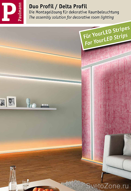 - Стр.280-281. Раздел: Function (Подсветки). Впервые в Каталоге – Серия Delta Profil. Новые возможности для непрямого освещения (подсветки) плинтусов. Система представляет собой угловой алюминиевый профиль (в который проклеивается светодиодная лента), размером 1м (арт. 702.62) или 2м (арт. 702.61), защищено от внешних воздействий матовой пластиковой панелью. Варианты установки – освещение плинтусов или подсветка полок, мебельных шкафчиков и т.п.