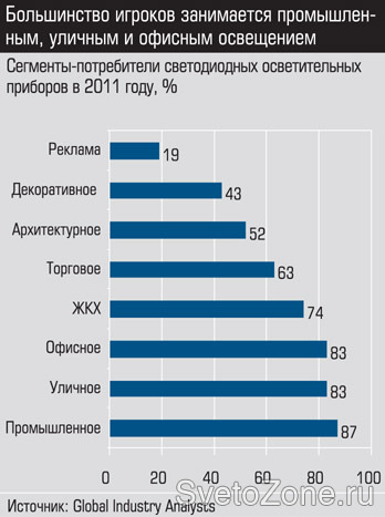 В первую очередь программы по энергосбережению и энергоэффективности начали внедряться в платежеспособных госмонополиях — РЖД, Газпроме, Роснефти. Постепенно переходят на светодиодное освещение и крупные энергоемкие промышленные предприятия в металлургии, энергетике, нефтехимической отрасли, на транспорте. Самыми популярными сегментами на сегодня игроки рынка считают промышленное, уличное и офисное освещение, далее следует ЖКХ, торговое, архитектурное, декоративное и рекламное. Можно также отметить рост интереса в области светодиодного торгового освещения: 46% компаний имеют в своих линейках такие решения.