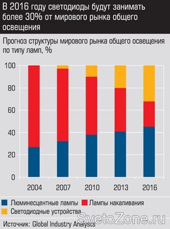 С одной стороны, понятно, что создание новой отрасли быстро и гладко не происходит. Мировой рынок светодиодов развивается с 2000 года с огромной скоростью. Этому способствует общемировой тренд перехода к энергоэффективным технологиям и рост уровня светоотдачи светодиодов в несколько раз (до 139 лм). Такие показатели дают светодиодам реальный шанс теснить другие виды источников света в общей структуре рынка. Рынок светодиодных светильников в мире вырос до 9,3 млрд долларов в 2011 году: увеличение по сравнению с 2010 годом на 45%. По прогнозам Global Industry Analysts Inc, в 2016 году светодиоды будут занимать более 30% от мирового рынка общего освещения. «Россия, как и весь мир, находится на первом этапе светотехнической революции, когда исследования и разработки переходят из плоскости опытного применения в сферу массового производства и завоевания рынков», — говорит Александр Морозов, председатель правления только что созданного Некоммерческого партнерства производителей светодиодов и систем на их основе (НП ПСС), объединившего 14 крупнейших светодиодных производителей.