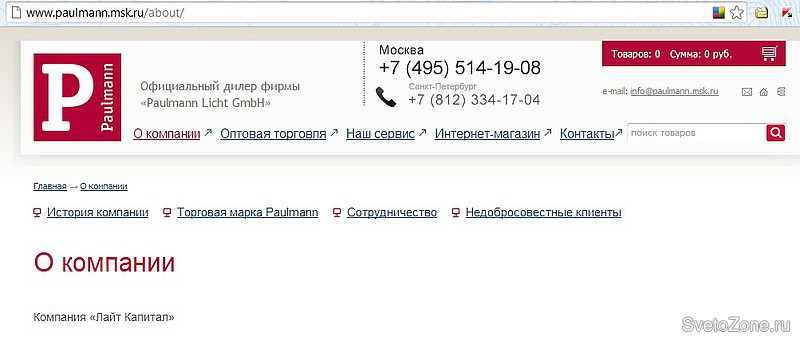 Раздел «О компании». Добавлены подразделы: «История компании», « Торговая марка «Paulmann», « Сотрудничество», «Недобросовестные клиенты».