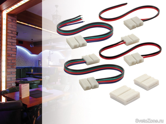 Коннекторы рекомендуется использовать для модулей LED с шириной ленты 8 мм или 10 мм, в версии с 2 или 4 жилами, в зависимости от типа ленты LED, с сечением провода 0,2 мм.