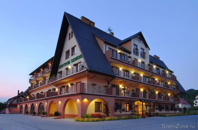 Первый представляемый проект - это «Центр пожилых людей» в Дрогини. Фасад здания освещен настенным светильником BART EL-160, вход в здание освещен герметичным плафоном LUVEN MX-218/38-W, а балконы в свою очередь освещены плафоном с высоким IP44 VOLIN EL-9-B. Процедурные кабинеты и проходы между ними освещены светильником NOTUS 418-EVG PAR NT и герметичным плафоном LUVEN MX-218/38-W. Рабочее место на кухне «Центра пожилых людей» освещено пыленепроницаемым светильником MAH PLUS-236.