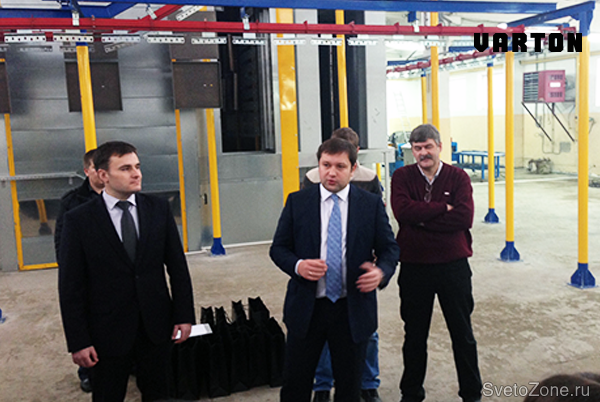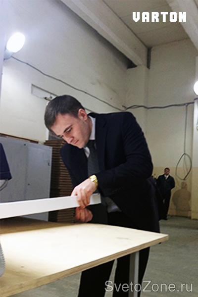 Гостям было предложено познакомиться с циклом производства офисных светильников – от стадии обработки металлического листа до сборки полноценного осветительного прибора. После покраски корпуса светильника наступила очередь сборки, которой занимались руководство Группы компаний «Вартон» и глава администрации Богородицкого района. Результат совместной работы – первый светильник – проверен на работоспособность и будет помещен в музей Группы компаний как особо ценный экспонат.