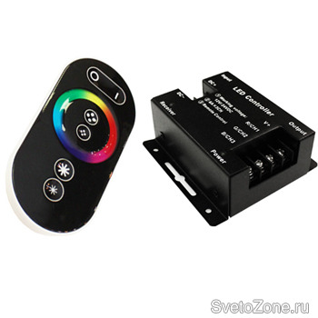 В комплект входит стильный сенсорный пульт ДУ, позволяющий выбирать режим переключения цвета и яркости RGB светотехники. В память контроллера записаны 18 программ: выбор 7 статичных цветов свечения, 11 динамических программ смены цвета свечения в разной последовательности, плюс режим прямого выбора цвета свечения посредством тачпада — цветного сенсорного кольца. Кроме изменения яркости, имеется возможность ускорить или замедлить программу динамической смены цвета свечения.