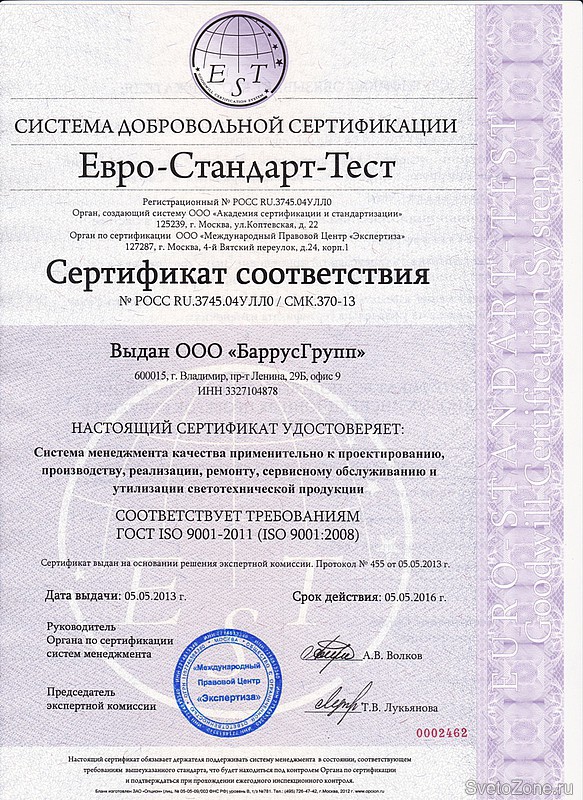 Теперь система менеджмента качества ООО "БаррусГрупп" соответствует стандарту ISO 9001 в отношении разработки, производства, реализации и гарантийного обслуживания светодиодной продукции.