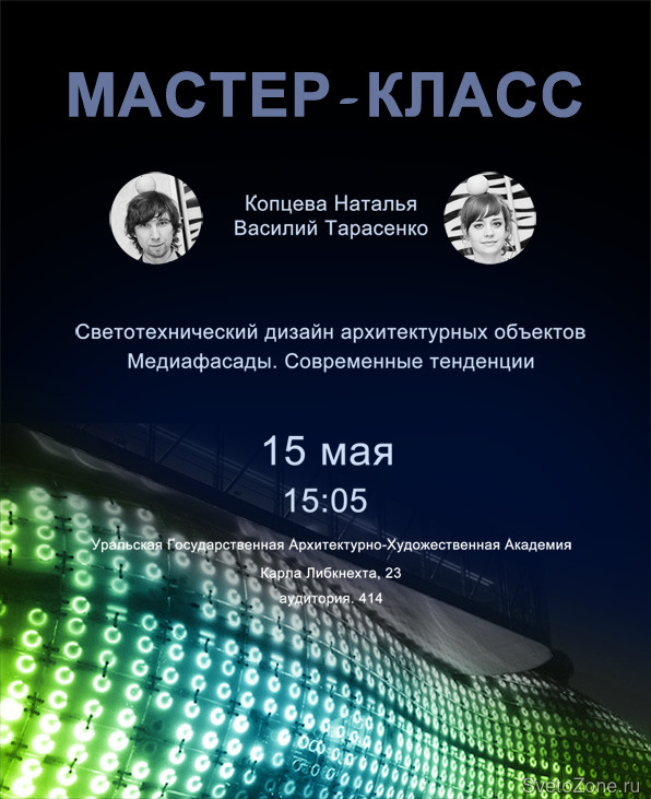 15 мая 2013 г. светотехническая компания «МТ ЭЛЕКТРО» проведет мастер-класс на тему «Светотехнический дизайн архитектурных объектов. Медиафасады. Современные тенденции в архитектурном освещении» для студентов Уральской Архитектурно-Художественной академии.