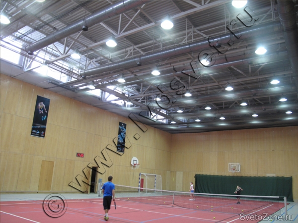 Специалистами компании НАНОСВЕТ на высоте 8 метров выполнена замена существующей системы освещения, состоящей из 36 светильников 3*60 Вт и 20 прожекторов с галогенными лампами 250 Вт, общим энергопотреблением 11,5 кВт. При этом уровень освещенности на поверхности игрового зала составлял 290-320 люкс. Установка 30 индукционных светильников с лампами GCL 150 Вт позволила снизить энергопотребление до 4,5 кВт, повысив уровень освещенности до 370-390 люкс. Важно отметить, что для спортивных объектов важен высокий индекс цветопередачи, а у индукционных ламп он составляет 80-85 Ra.