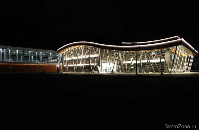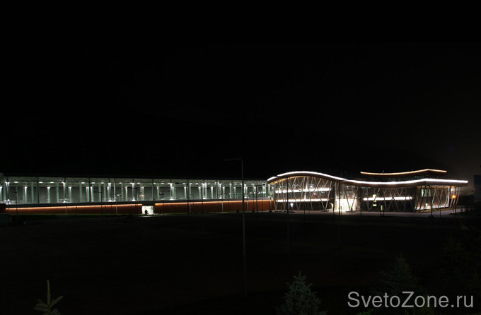Вокзальный комплекс "Альпика-Сервис" состоит из двух архитектурных элементов: основного объема (станции) и пассажирских платформ. Для реализации основной идеи архитектурной концепции комплекса - создания единого пространства с окружающей природной средой – были использованы мотивы очертаний Кавказских гор. Плавный силуэт здания вокзала органично взаимодействует с местным архитектурным контекстом, не нарушая целостность горного пейзажа. Фасады здания представляют собой комбинацию стекол с декоративными вставками и ламелями, окрашенными под дерево. Стеклянные элементы заполнения проемов спроектированы с использованием энергосберегающих решений. Линейные светодиодные светильники c теплыми и холодными светодиодами создают непрерывные линии, формируя оригинальный световой рисунок фасада. Для освещения платформ также использованы светильники серии с цветовой температурой 5200 К (холодный белый свет). Метровые IntiLINE, монтированные в специальные короба, обеспечивают функциональное освещение станции, создавая при этом максимально комфортную световую среду для пассажиров. В общей сложности на объекте было установлено более 500 светодиодных светильников серии IntiLINE производства "IntiLED".