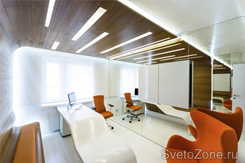 В кабинете установили современное освещение - в потолочную конструкцию встроили 9 различного размера. Эти трубки закрыты матовым оргстеклом и создают эффект светящихся полос. Светодиодные лампы по многим характеристикам превосходят традиционные, они работают при напряжении сети 220 В, при этом экономят до 60% энергии, светят очень ярко и прослужат около 10 лет! Кроме того, они экологичны и безопасны, не содержат вредных веществ (таких, как ртуть), не нагреваются и не мерцают.