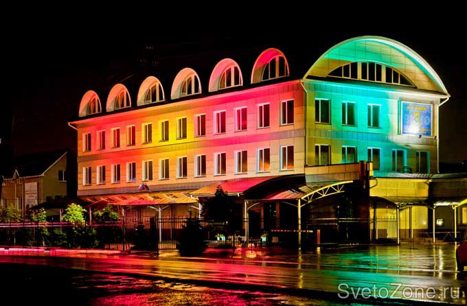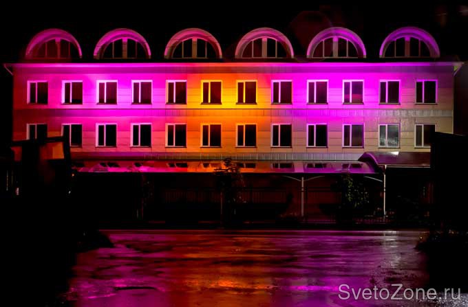 Построение запоминающегося ночного образа здания, отличного от дневного, — один из наиболее распространённых подходов к созданию проекта архитектурно-художественного освещения. Особенно актуален он для современных зданий, имеющих несколько направлений коммерческого использования. Насыщенные цвета фасадного освещения привлекают внимание посетителей, создают узнаваемый и неповторимый образ даже для самого типового здания. При этом зачастую это могут быть достаточно экономичные решения, не требующие значительных финансовых вложений. В проекте освещения БЦ "Флора" в г. Владимир эффектный световой образ достигается за счет использования всего нескольких метровых RGB светильников серии IntiLINE, установленных на крыше паркинга бизнес-центра, что уже позволяет обеспечить равномерное заливающее освещение фасадов здания.