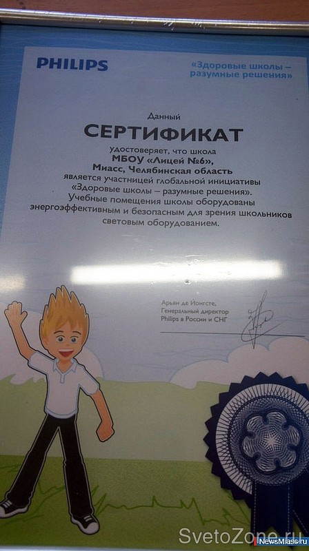 Порядка 20 тысяч евро смогли заработать воспитанники и педагоги лицея № 6, представив проект современного освещения учебного заведения на конкурс, который был объявлен компанией Philips в рамках благотворительной инициативы "Здоровые школы - разумные решения". В апреле лицеисты защитили свою работу, а уже в начале октября в основном корпусе лицея № 6 было смонтировано новое современное освещение на третьем этаже и в школьной столовой. Именно это и стало наградой за достойный проект. Кстати, разработать качественное решение освещения лицеистам помогло и тесное многолетнее сотрудничество с Миасским машиностроительным заводом.