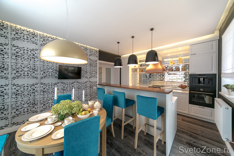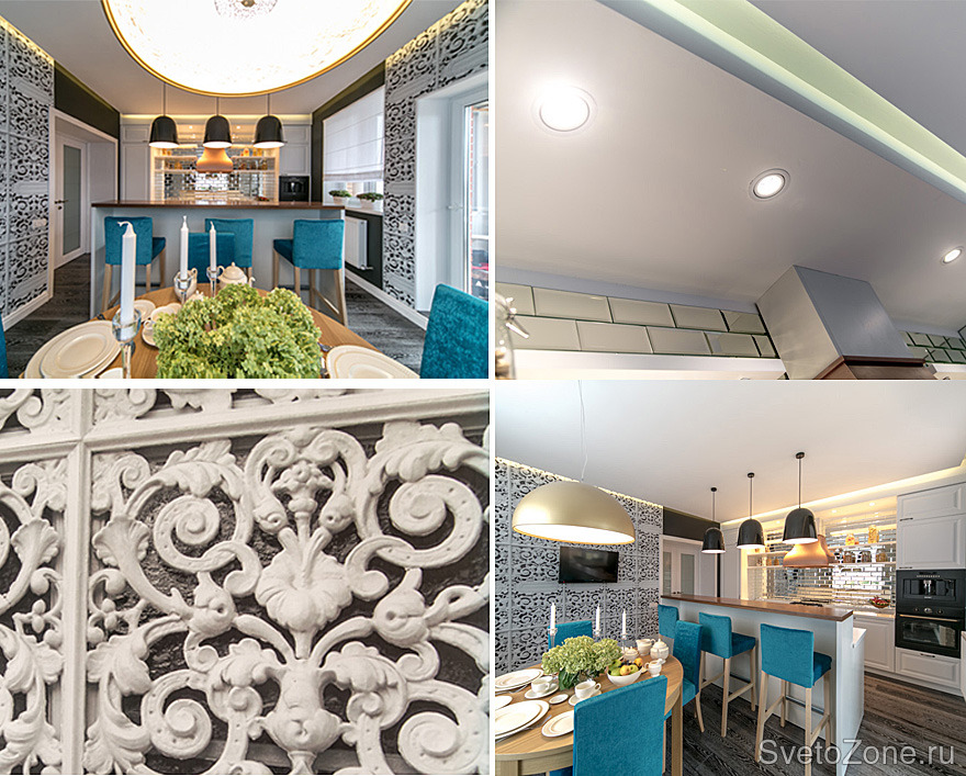 Интерьер получился просторным и светлым. Объединяющей подсветкой является светодиодная лента, закрепленная по всему периметру потолка и дающая мягкий, неназойливый свет. Изысканная солнечная люстра над обеденным столом изнутри декорирована лепниной. Над рабочей зоной установили встроенные светодиодные споты. А оконные проемы подсветили небольшими бра. В зоне острова и барной стойки три подвесных абажура закрыты светорассеивателем с цветочным орнаментом дающие узорчатый рисунок света.