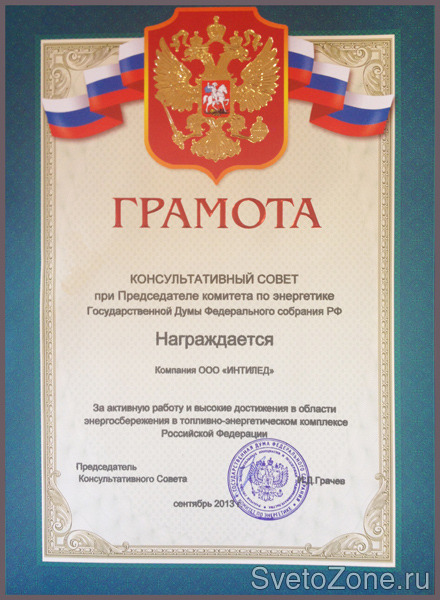 Активная работа компании "IntiLED" была отмечена Консультативным советом при Председателе комитета по энергетике Государственной Думы Федерального собрания РФ: по окончании конференции представитель компании был награжден грамотой за высокие достижения в области энергосбережения в топливно-энергетическом комплексе РФ.