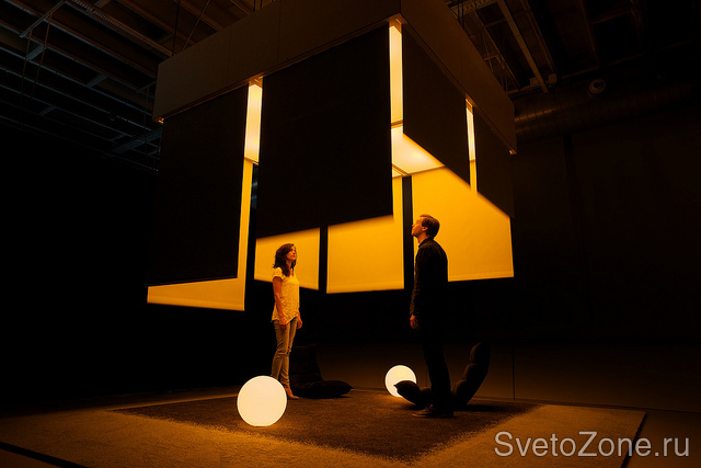 Перемещаясь внутри созданной интерактивной зоны, пользователь интуитивно управляет ей и настраивает под себя. Когда он входит, сенсоры медленно включают свет и изменяют его оттенки. Теплые цвета благоприятно влияют на психофизиологическое состояние и поднимают настроение. Холодные оттенки помогают взбодриться и настроиться на работу. Затем с потолка плавно опускаются текстильные полотна и разделяют пространство на несколько частей, в зависимости от движений человека они меняют свое положение. Находясь в поле работы сенсоров, можно влиять не только на визуальные изменения, но и на звуковое наполнение.