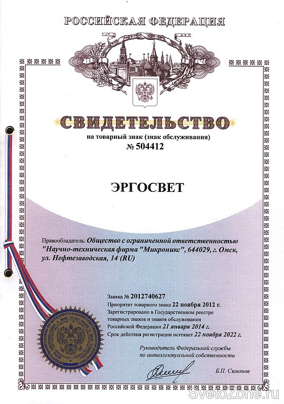 Федеральной службой по интеллектуальной собственности, патентам и товарным знакам зарегистрирован товарный знак «ЭРГОСВЕТ», правообладателем которого является ООО НТФ «Микроникс» г. Омск.