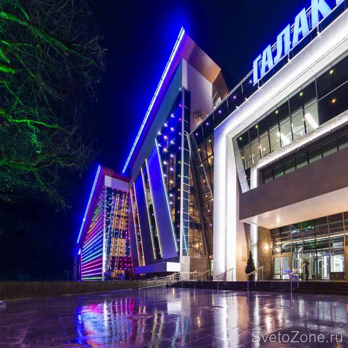 Общественно-культурный центр "Галактика" - это финальный объект ОАО "Газпром" в рамках подготовки к Олимпийским играм Сочи-2014. Уникальность центра не только в его расположении на высоте 540 метров над уровнем моря и в небывалых для региона масштабах, а в формате, аналогов которому нет ни в России, ни за рубежом. "Галактика" - это функционально насыщенный комплекс, основу которого составляют развлекательные направления с использованием новейших достижений техники, а торговые зоны являются второстепенными. Необычный формат удачно дополняет оригинальная архитектура здания: динамичные диагональные пилоны, стеклянные фасады, скошенная многоуровневая крыша. Специально для этого объекта компанией IntiLED совместно со светотехнической компанией "Зодиак" была разработана система наружного освещения, подчеркивающая необычную архитектуру и дополняющая космический образ "Галактики". Неотъемлемой частью подсветки стала уникальная система управления освещением, разработанная специалистами IntiLED индивидуально под данный объект.