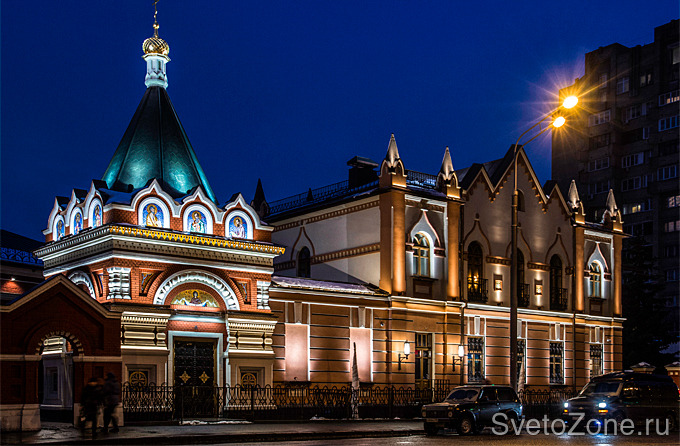 Основной задачей архитектурного освещения в данном случае было максимально выявить силуэт зданий, подчеркнуть самобытность форм православного монастыря и своеобразие ансамбля в целом. Для реализации этой концепции авторы проекта, специалисты компании "СветСтройСервиc", применили несколько типов световых приборов производства "IntiLED". Линейные светильники серии IntiLINE с корпусами различных длин создают равномерное освещение элементов иконографии часовни и контурную подсветку карнизов молельного дома, а компактные прожекторы IntiROLL выделяют шатровый граненый купол, межоконные пространства и многочисленный декор фасадов.