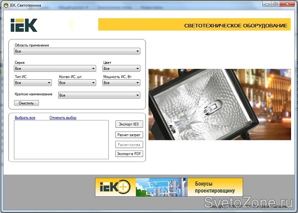 Встроенный калькулятор: возможность приблизительно рассчитать необходимое количество выбранных светильников.