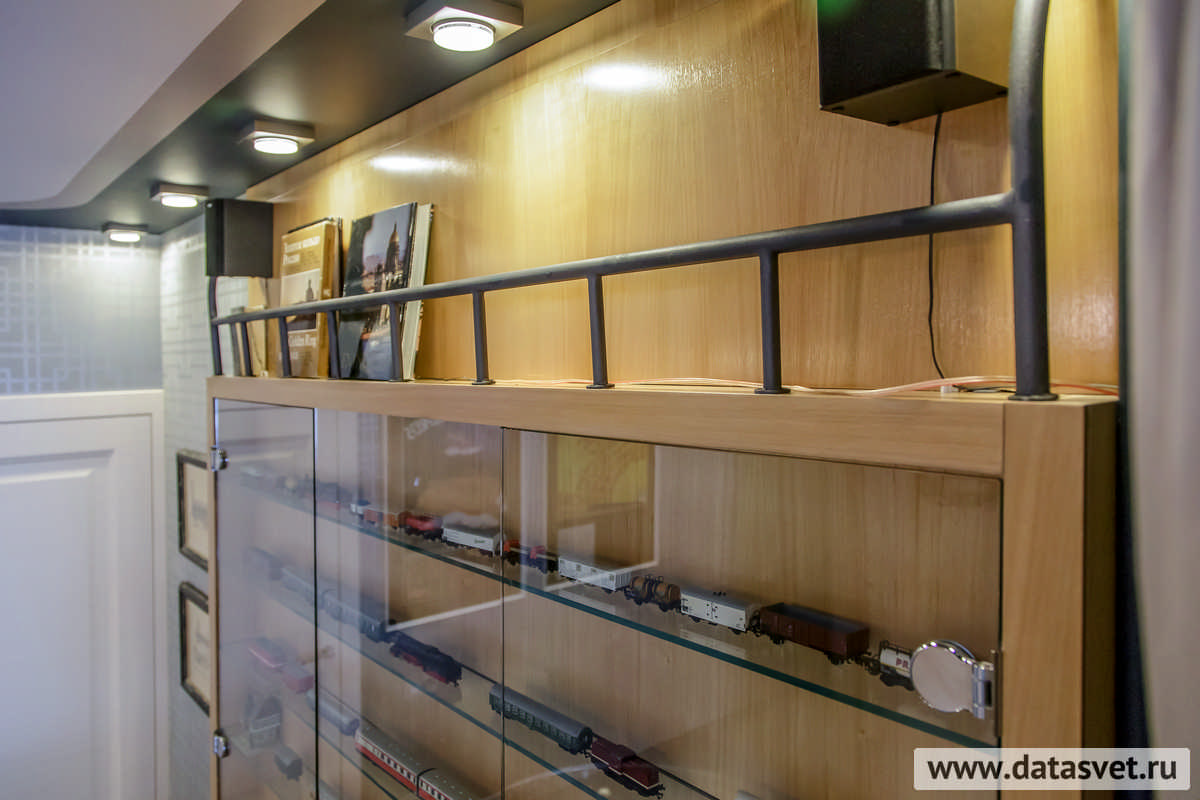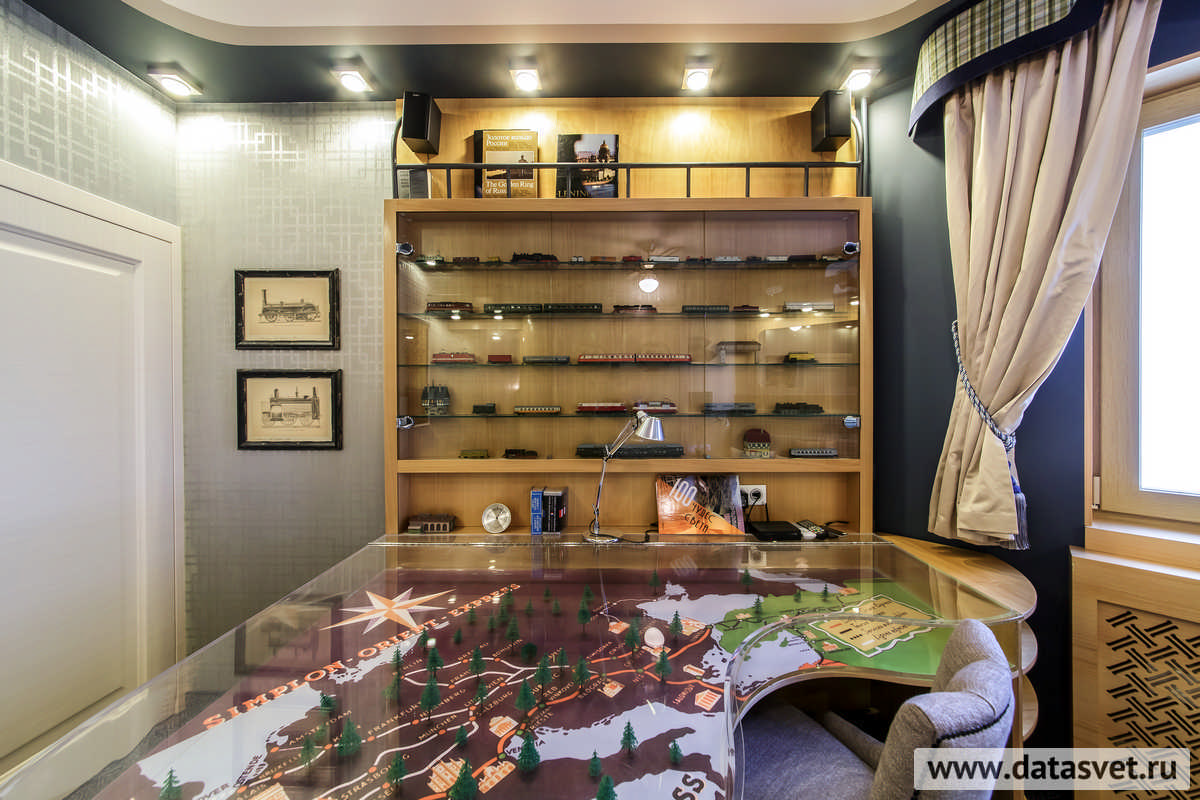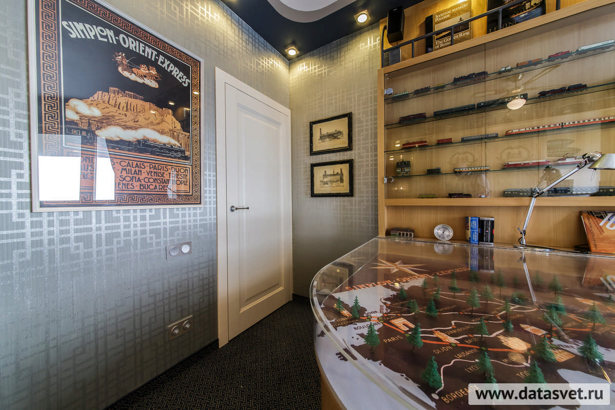 - в рабочем секторе – над шкафом и вдоль стен, – где не только свечение, но и внешний вид светильников, комплементарно сочетаясь с освещаемой ими редкой коллекцией моделей поездов, поддерживают «поэтику» путешествия на таинственном и романтичном «Восточном экспрессе».