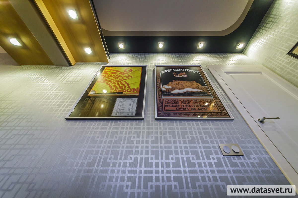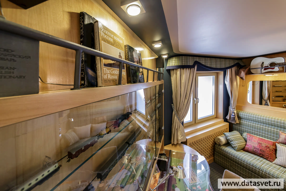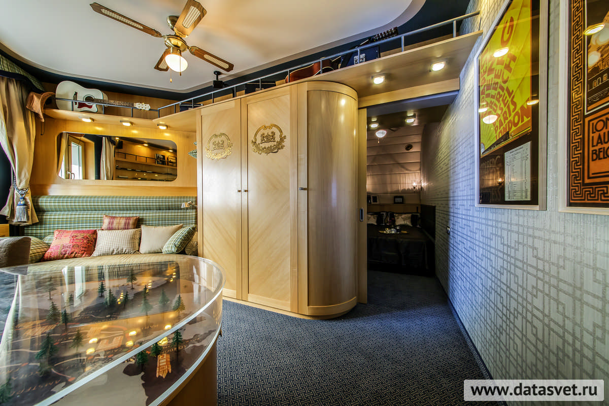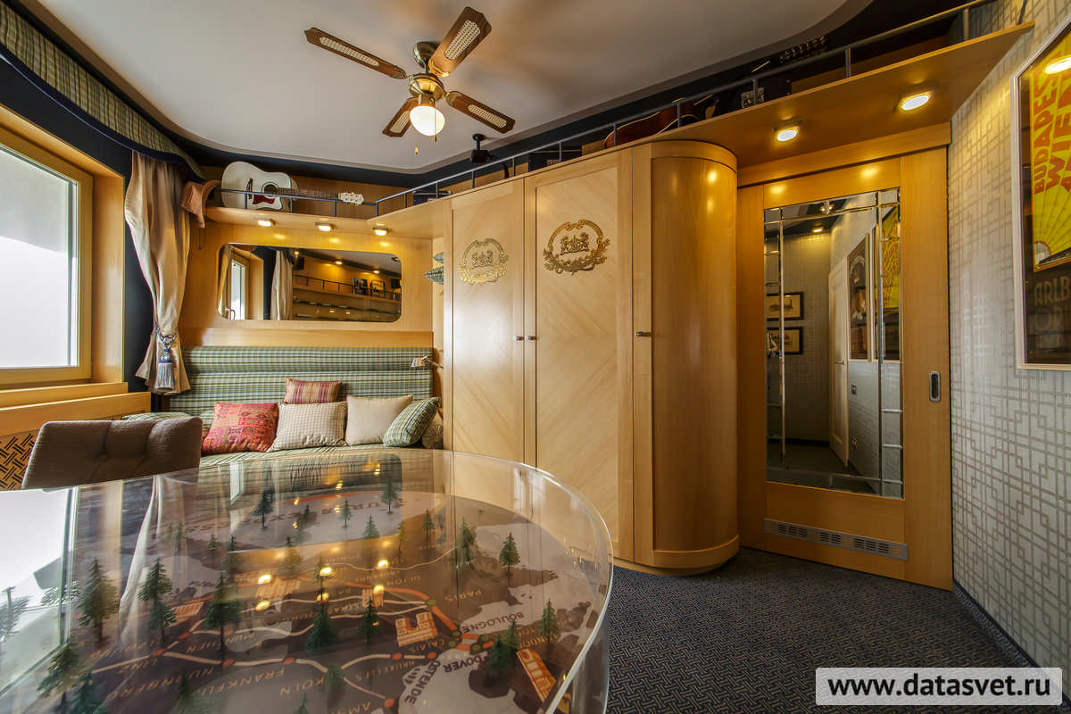 - в рабочем секторе – над шкафом и вдоль стен, – где не только свечение, но и внешний вид светильников, комплементарно сочетаясь с освещаемой ими редкой коллекцией моделей поездов, поддерживают «поэтику» путешествия на таинственном и романтичном «Восточном экспрессе».