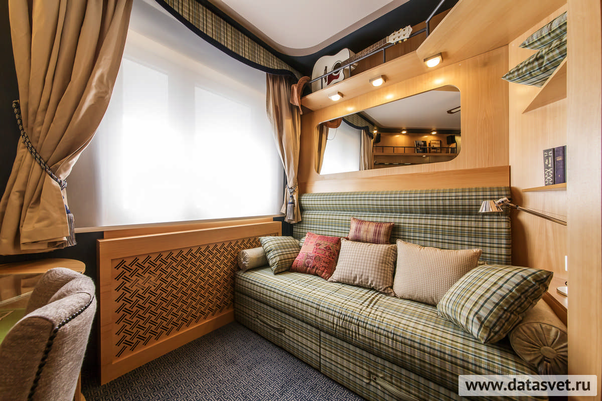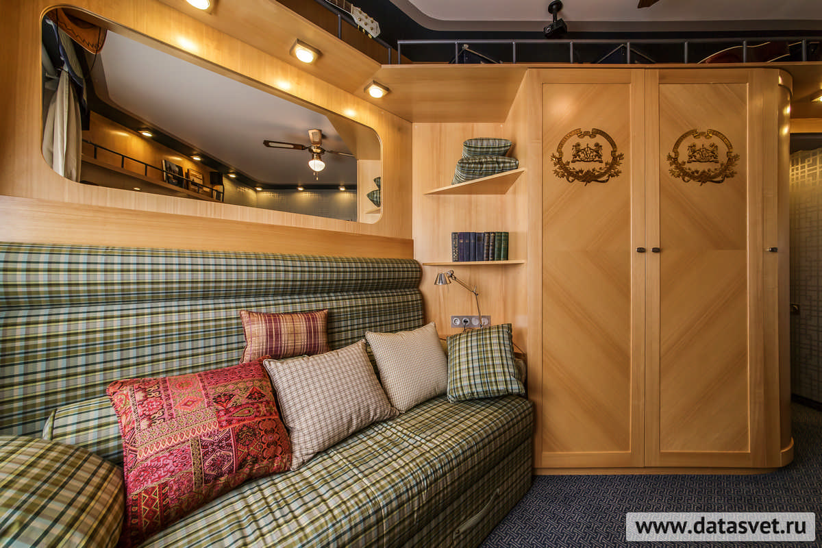 Обратите внимание, что в некоторых случаях светильники закреплены потолочно, а в иных – аккуратно встроены в функционально необходимую антресоль или дополнительные панели, что создает в целом многоуровневость освещения, абсолютную «пронизанность» комнаты светом (общая цветовая «палитра» – 2700 К, - теплое белое свечение). Во многом благодаря им, 12,7 м2 (с 5,2 м2 кладовой) комнаты кажутся гораздо более обширной площадью. Заметим, что может показаться – количество осветительных приборов на одну комнату преувеличено. Но и тут есть достойное объяснение – светильники могут включаться и выключаться по отдельности, что создает как разные «программы» освещения с соответственно разными настроениями, так и экономию энергии в целом (в добавок к тому, энергосберегающая технология, являющаяся основой светильников, в принципе позволяет экономить до 80% энергии). Не случайно, счастливые обладатели новой комнаты сразу же отметили это достоинство - Екатерина, супруга хозяина дома, отдельно подчеркнула: «Замечательно реализовано освещение. Много вариантов включения, кроме того, каждый встроенный светильник можно включить и выключить локально, на каждом – свой выключатель».