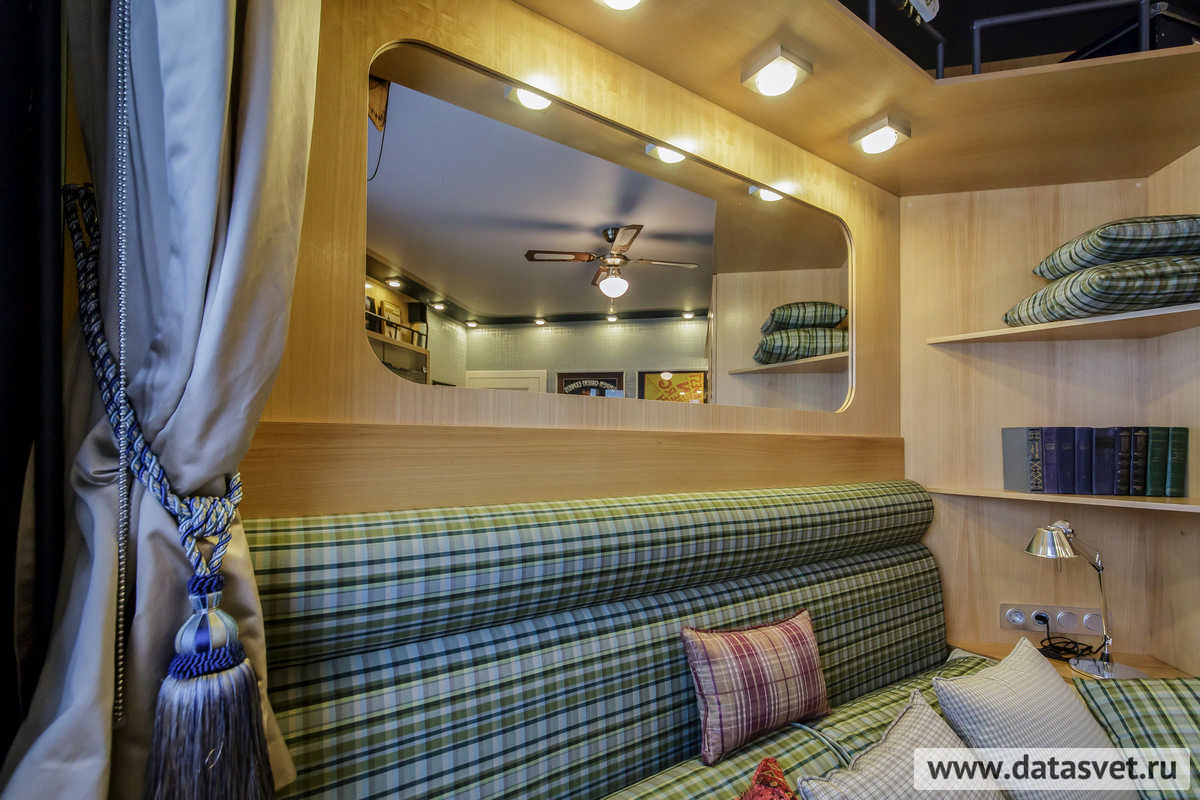 - в уютной интимной спальной зоне (кровать установлена в бывшей кладовой) и над входом в нее (где дверь представляет собой выдвижное зеркало, что требует обязательной подстветки);