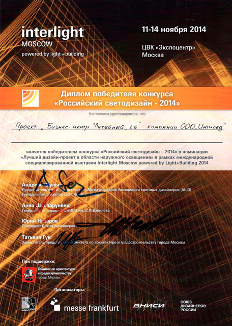 В этом году компания получила награду в номинации «Лучший дизайн-проект в области наружного освещения» за проект освещения «Бизнес-центр «Литейный, 26».