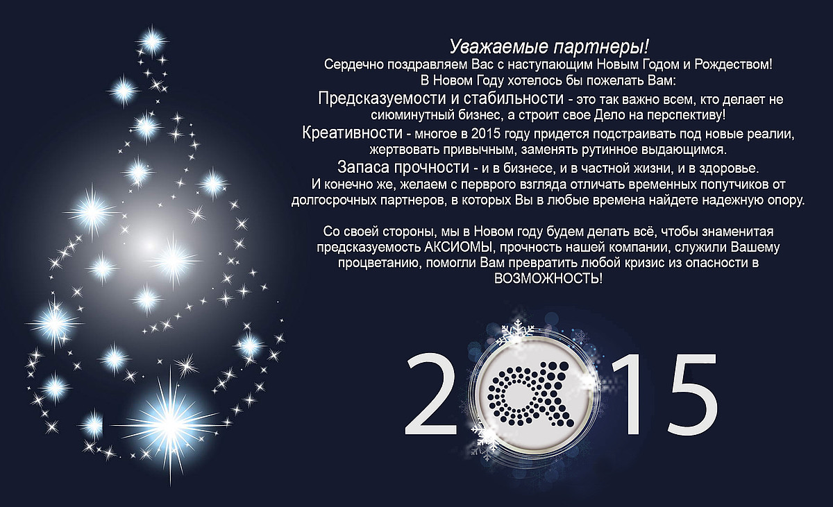 Со своей стороны, мы в Новом году будем делать всё, чтобы знаменитая предсказуемость АКСИОМЫ, прочность нашей компании, служили Вашему процветанию, помогли Вам превратить любой кризис из опасности в ВОЗМОЖНОСТЬ!