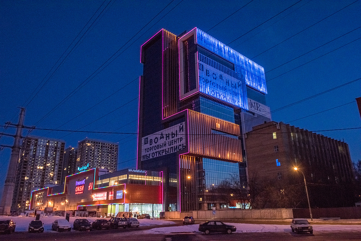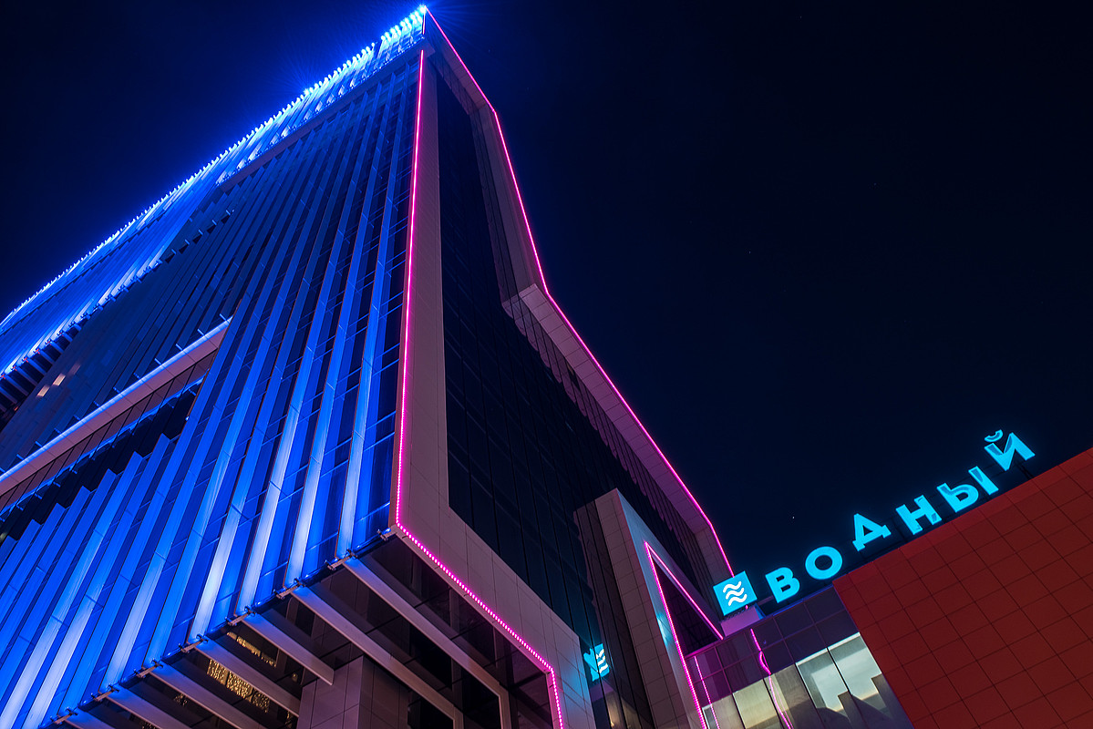 Philips реализовала комплексный проект архитектурного, а также внутреннего основного и декоративного освещения объектов, входящих в архитектурную группу многофункционального комплекса класса А «Водный» на северо-западе Москвы. В бизнес-центре в зоне ресепшн установлена самая крупная в России композиция из светодиодных панелей Philips Luminous Textile. Для фасадного освещения были выбраны специальные улучшенные светильники с выделенным оранжевым и синим светом Philips Color Kinetics. При реализации функционального освещения торгово-развлекательного центра использованы только светодиодные световые решения, которые позволяют минимизировать расход электроэнергии на освещение.
