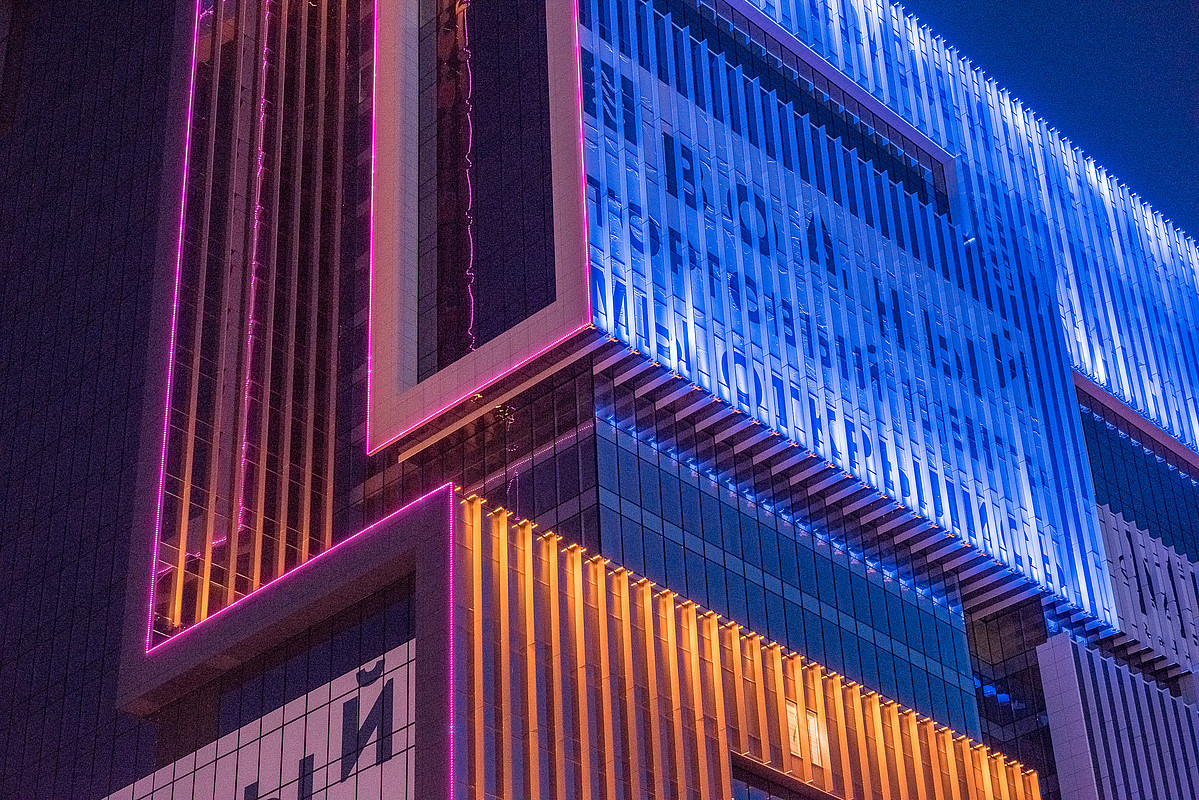 Специалисты компании Philips разработали единую концепцию внутреннего и внешнего освещения, которая соответствует названию МФК – «Водный». Эта концепция нашла отражение в архитектурном освещении бизнес-центра. Cветовые сценарии воссоздают эффект перелива морских волн. Инновационное освещение 26-этажного здания подчеркнуло футуристическую архитектуру и идеально вписалось в общую световую картину столицы, став украшением города.