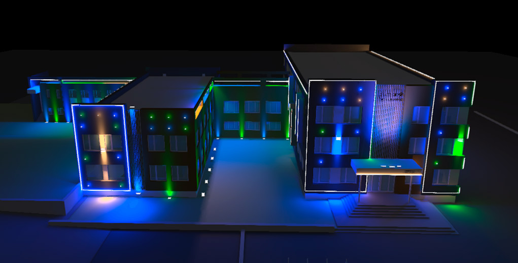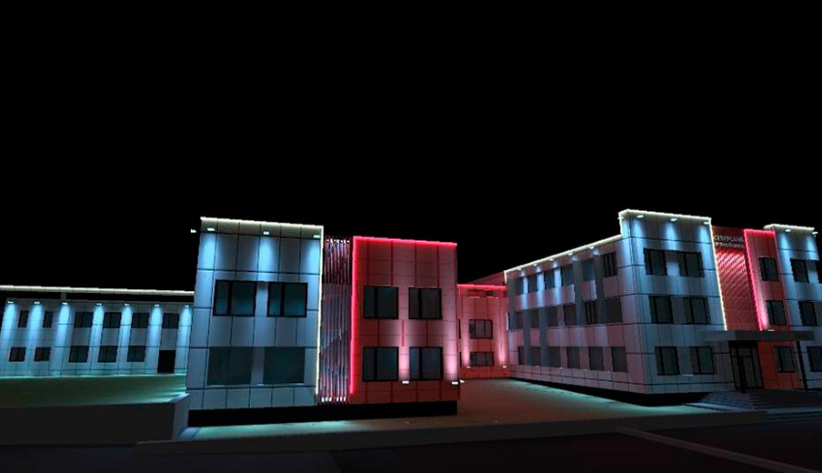Второе место было присуждено Порубову Александру за гармоничную концепцию освещения. Александр грамотно разместил прожекторы в межоконных пространствах, задействовал акцентные светильники серии IntiROLL для равномерного освещения решетчатых областей фасада здания.