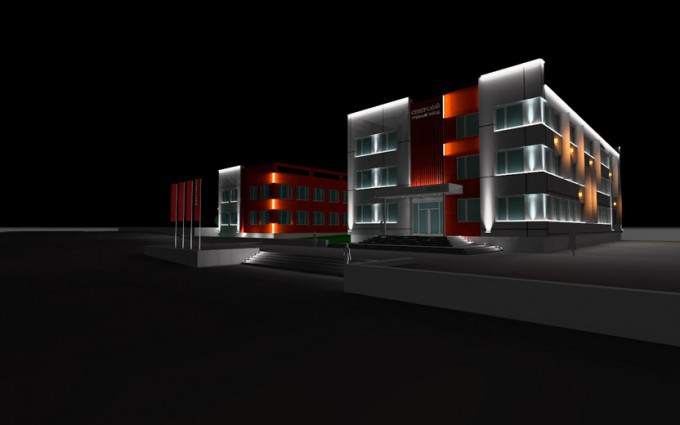 Третье место занял проект Дементьева Александра, в котором были использованы различные типы оборудования. Акценты в проекте созданы точечными светильниками IntiTOP, размещенными на лицевом фасаде здания, а также полноцветными светильниками IntiTUBE, очерчивающими его конуры.