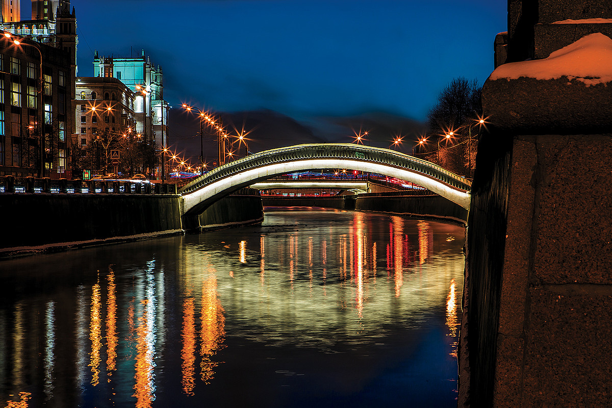 Так называемые «малые» мосты – Астаховский, Тессинский, Малый Москворецкий, – освещены статично оттенками тепло-белого и золотого цветов света.
