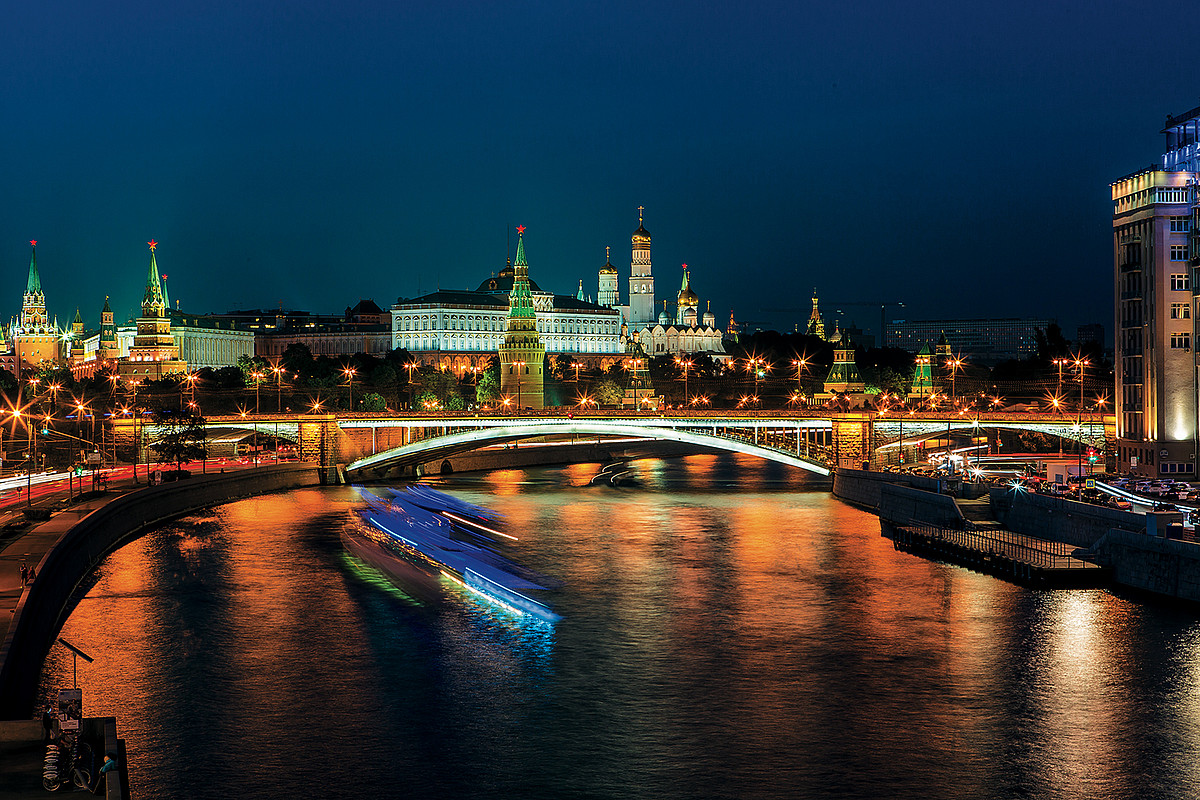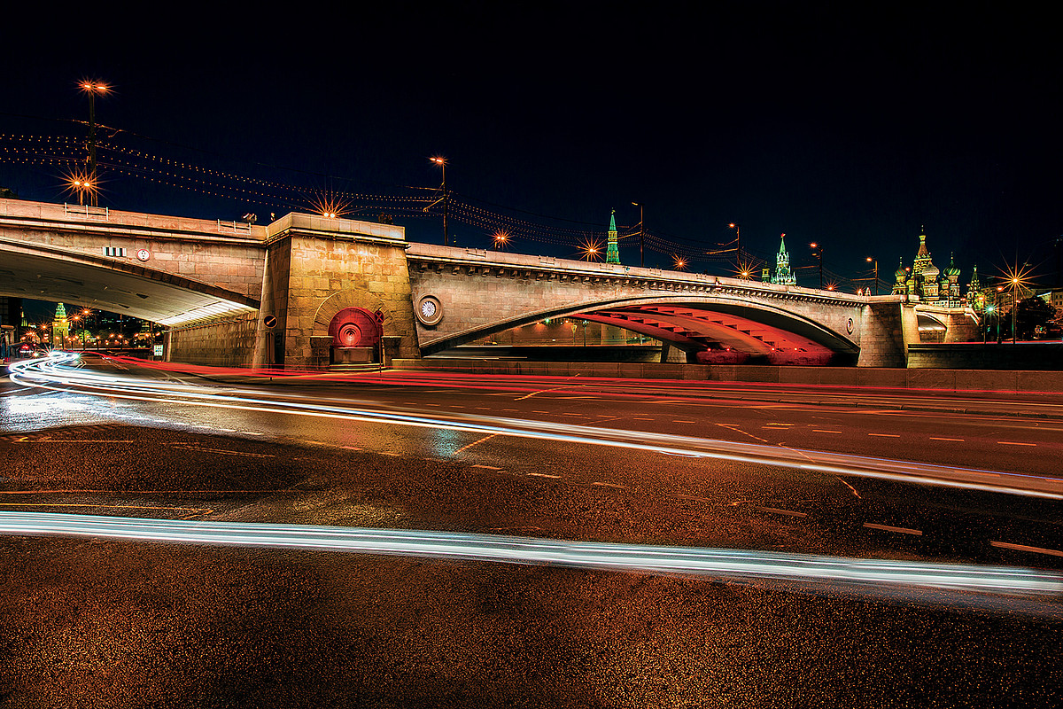 Основа освещения Большого Каменного моста – сочетание цветов природного белого кварца с необработанной поверхностью золотого самородка. Большой Каменный мост, оставаясь цельным самодостаточным световым образом, в то же время перекликается с блеском золотых Кремлевских куполов.