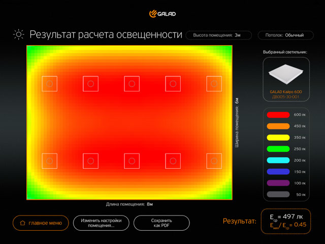 Приложение предназначено как для специалистов светотехнической отрасли, так и людей, которым необходим расчет освещенности без терминологии и усложнений. Программа позволяет с легкостью демонстрировать возможности офисных светодиодных светильников GALAD.