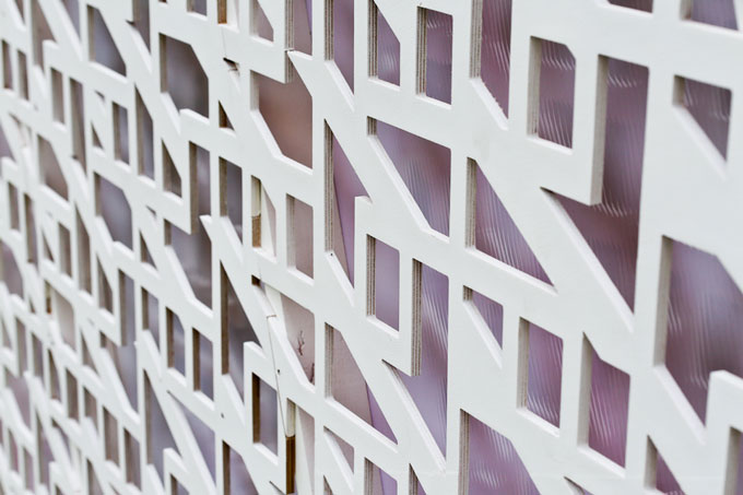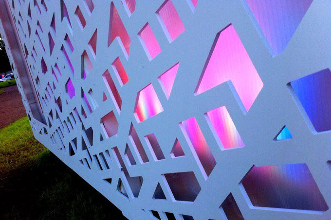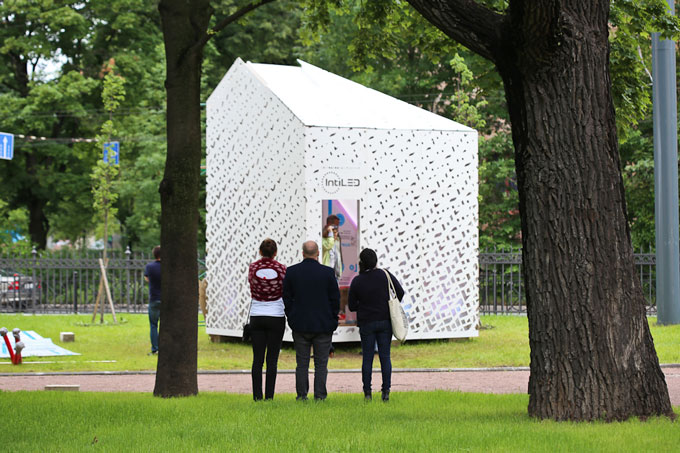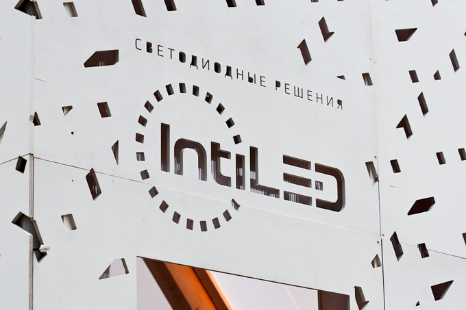 Эксперимент в архитектуре продолжился экспериментом со светом. В основании конструкции модуля между двумя листами матового поликарбоната были установлены линейные RGB светильники серии IntiLINE. Через поликарбонат свет рассеивается, образуя мягкое свечение как снаружи, так и изнутри. По контуру, подчеркивая ломаную геометрию, размещены светильники серии IntiTUBE. Все оборудование настроено в режиме плавного перелива.