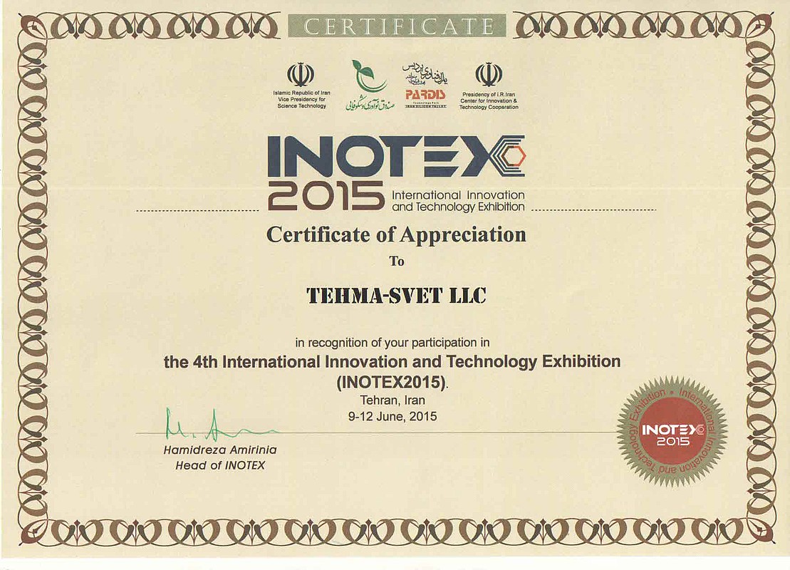 4-я Международная выставка инноваций и технологий INOTEX 2015 прошла 9-12 июня в выставочном комплексе Тегерана (Иран). Было представлено более 150 известных компаний из 15 стран занимали площадь 3500 кв. м. Российская экспозиция была представлена 10 компаниями: НПП «ЭКРА», ОАО «Екатеринбургский завод по обработке цветных металлов», РАО «Роснефтегазстрой», ООО «Техма Свет», АХК «ВНИИМЕТМАШ», «Саровский Инновационный кластер», ООО «Инновации будущего», ФТЦ, «МАРКОН Инж. РУС», Ярус.