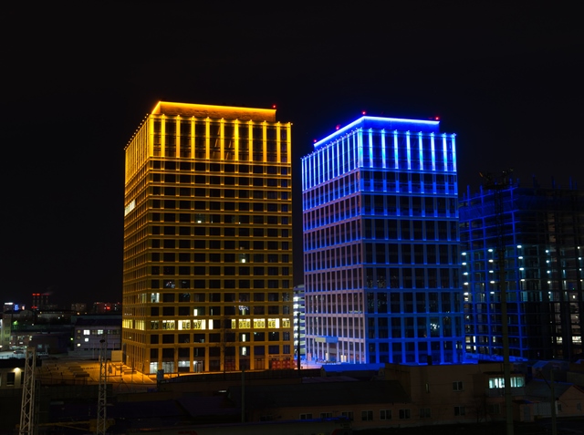 Для реализации проекта были выбраны энергоэффективные линейные светильники Philips Vaya Flood MP Architectural с желтыми и синими светодиодами. Благодаря освещению ультрамариновым светом здание с серым фасадом в ночные часы становится заметнее и принимает более торжественный вид, а сочетание синего и желтого цветов придает всему комплексу динамику. Выразительность архитектурного освещения обеспечивают светильники Philips Vaya Linear LP, которые заливают перекрытия на технических этажах обоих зданий и создают вертикальные световые линии. Светильники расположены под самой кровлей, что придает конструкции воздушность и производит впечатляющий визуальный эффект.