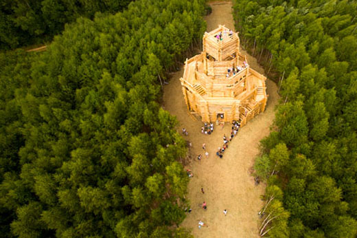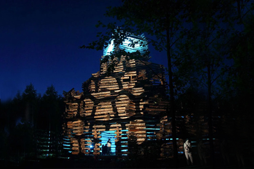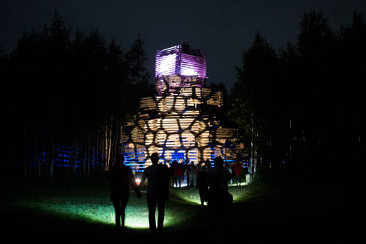 Бельведер «Ленивый Зиккурат» - это 18-тиметровое деревянное строение, своеобразный инженерный эксперимент, созданный в 2014 году усилиями бюро «Поле-Дизайн». Он собран по древнерусским строительным технологиям без единого гвоздя. Оригинальные формы и структура сооружения позволили создать необычное световое пространство с использованием оборудования IntiLED. Линейные прожекторы IntiLINE RGB были установлены снаружи на верхнем ярусе и внутри первого уровня бельведера. Свет от них, проходя сквозь щели в конструкции, образовывал интересные проекции на окружающий башню лес. Управление оборудованием осуществлялось через DMX контроллер удаленно с помощью пульта. Идея концепции освещения принадлежит команде «CLE-A Team».