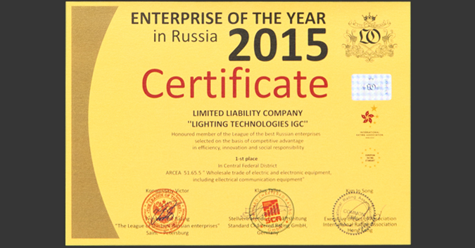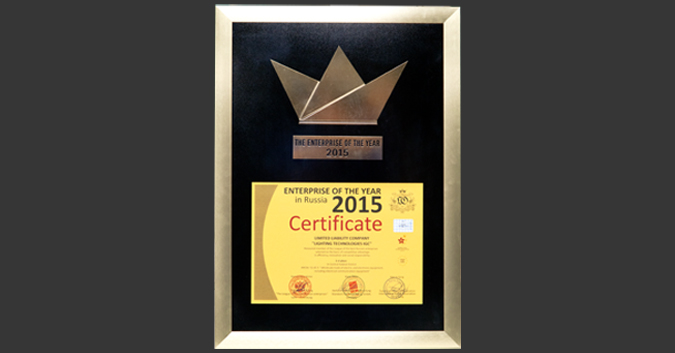 Компания «Световые Технологии» заняла 1 место в Международном экономическом рейтинге «Лига Лучших» среди российских предприятий за 2015 год по профилирующему ОКВЭД 31.5 «Производство электрических ламп и светотехнического оборудования» и получила статус-звание «Предприятие года 2015».